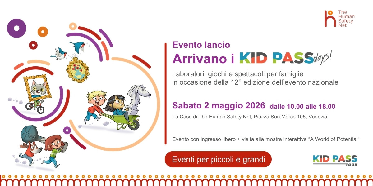 Uguali per i Figli sarà presente con laboratori e attività al grande evento per grandi e piccoli per lanciare la dodicesima edizione dei Kid Pass Days l’iniziativa nazionale dedicata alle famiglie per scoprire il patrimonio culturale, storico, artistico e scientifico di tutta Italia: una maratona di 150 eventi in presenza organizzati in simultanea, in collaborazione con 120 musei, spazi culturali, castelli, planetari, parchi archeologici e associazioni da nord a sud Italia. L’evento alla Casa di The Human Safety Net, a Venezia in Piazza San Marco 105, sarà un’intera giornata di workshop, laboratori e spettacoli per famiglie con bambini e bambine, ragazzi e ragazze all’insegna della gratitudine, del lavoro di squadra, dell’intelligenza sociale e dell’inclusione. Una giornata intera di attività a ingresso libero, organizzata da The Human Safety Net in collaborazione con Kid Pass e altri partner del mondo educativo, creativo e associativo.